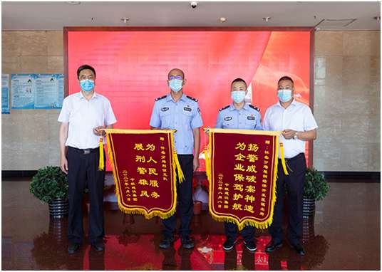 培训中心主任孔德明代表开云手机站登录入口-开云online(中国)向怀柔分局雁栖经济开发区派出所所长和怀柔分局刑侦支队支队长送上锦旗,代表公司感谢人民警察服务企业生产建设、守护一方平安付出的艰辛努力,感谢怀柔分局雁栖开发区派出所和怀柔分局刑侦支队急企业所急、想人民所想,在企业遇到困难时及时出警,有力保障了企业财产安全,维护了社会良好秩序,为企业发展创造了平安和谐的营商环境。