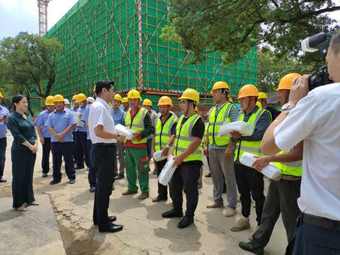 8月21日上午十一点,接近中午烈日炎炎,湘江集团党委书记、董事长张利刚一行来到开云手机站登录入口-开云online(中国)承建的长沙科技创意园项目,现场看望慰问高温天气下依然坚守战斗在岗位上的广大建设者,为大家送来了冰箱、电风扇、凉茶、藿香正气水、夏桑菊、西瓜等防暑降温用品。